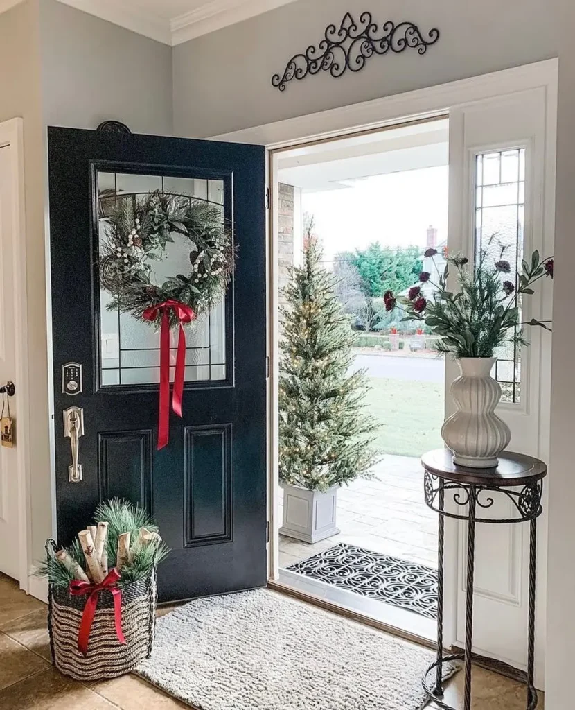 There’s something so comforting about the classic Christmas look. Picture red and green accents, lush evergreen garlands, and a wreath adorned with pinecones and berries. Add a touch of gold with bells or ornaments for that nostalgic holiday sparkle. A plaid runner or doormat can pull the whole look together, making your entryway feel like a cheerful nod to Christmases past.